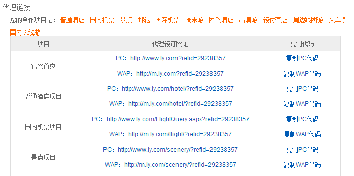 5) 联盟平台默认获取到的代理链接都是链向http://www.ly.com平台或各项目首页的,您也可以根据自身推广需求进行自定义代理链接,自定义代理链接的方法为:指定的页面URL后面加上?refid=XXXXXXX即可。